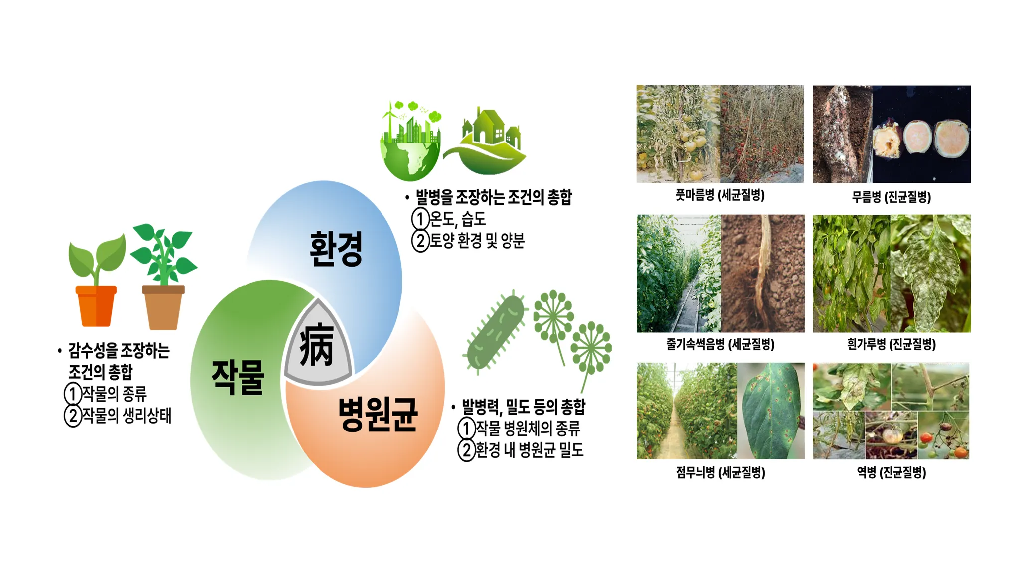작물 질병 발병의 3대 요소로는 재배 환경, 기주식물, 및 병원균으로 알려져 있으며, 이들 요소들에 의해 질병이 발생됩니다. 특히, 특정 작물 재배에서 병원성 미생물은 식물 병을 유발하여 생산량 감소에 큰 영향을 주는 것으로 알려져 있습니다.