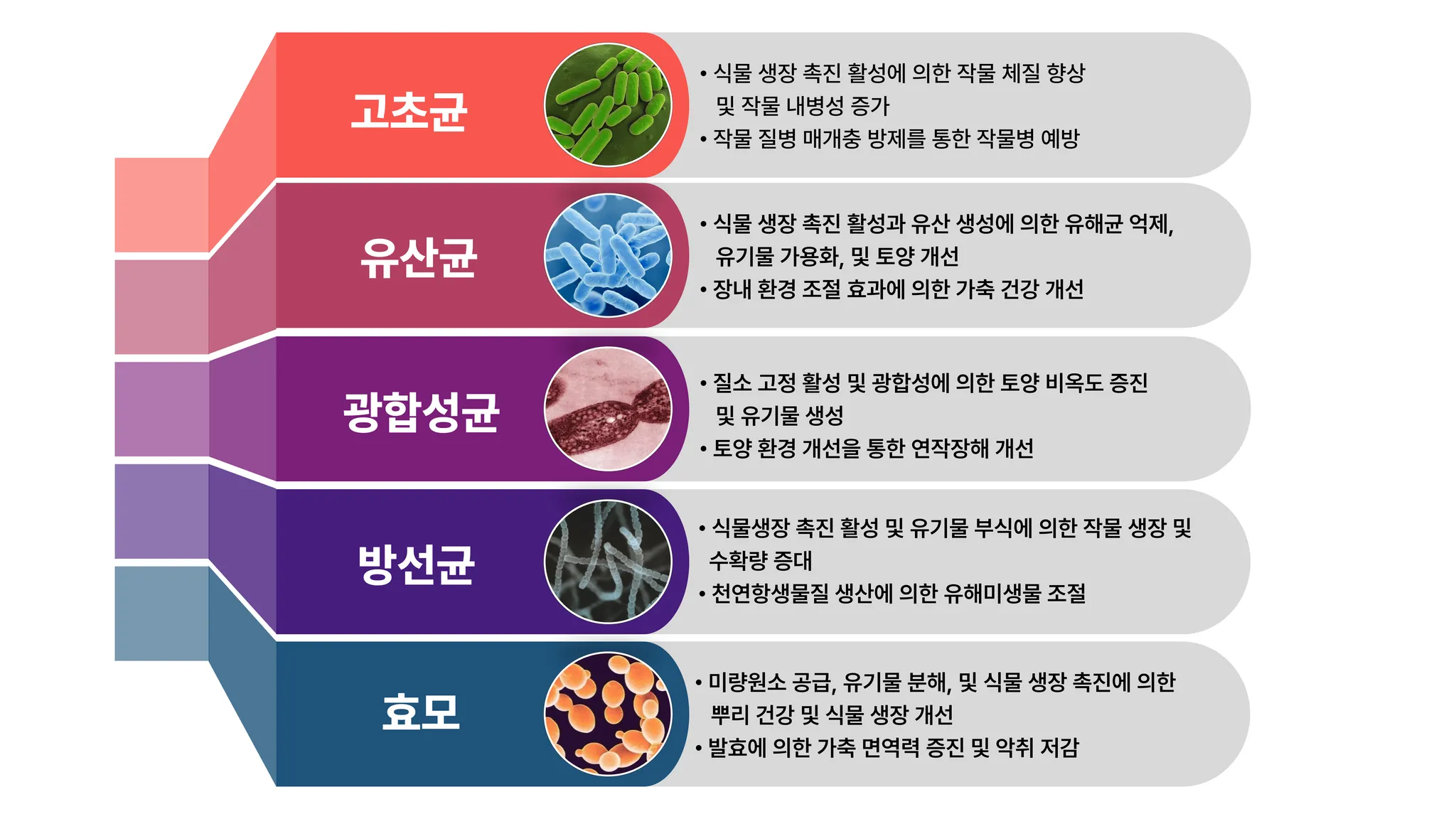 미생물은 농업 환경에서 토양 환경과 작물의 생장에 직접적인 관련이 있습니다. 현재 친환경 농법에서 가장 많이 사용되는 소재 중 하나가 바로 미생물제제입니다.